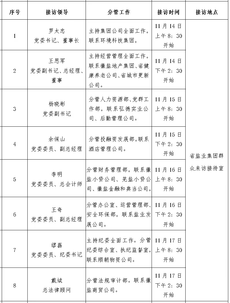 根據工作安排,現就省鹽業集團領導班子成員11月份接待省鹽業系統職工群眾來訪安排公示如下: