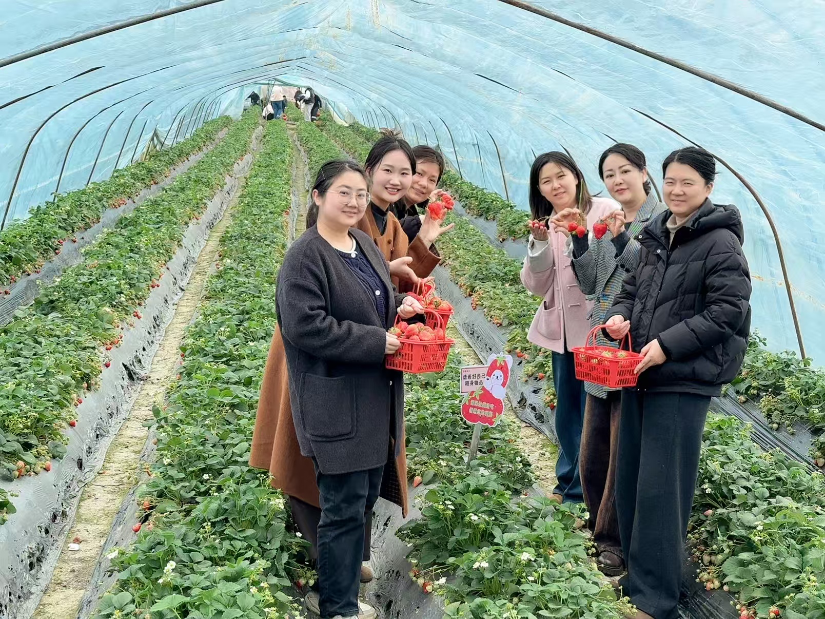 活動當天,陽光明媚,暖意融融。走進采摘大棚,清新果香撲面而來,翠綠藤蔓間,顆顆草莓鮮紅飽滿,在春光的映照下格外誘人。在工作人員講解采摘技巧后,大家手提果籃,化身田園體驗館,彎腰親摘、細心挑選,一遍分享心得、一邊拍照打卡,沉浸式體驗著采摘帶來的快樂與成就感,將工作的疲憊與生活的瑣碎都消散在這片清甜之中。